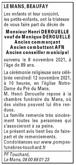 Décédé à Le Mans (72000, France) le lundi 8 novembre 2021 à l'âge de 89 ans