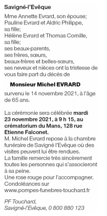 Décédé à Savigné-l'Évêque (72460, France) le dimanche 14 novembre 2021 à l'âge de 65 ans