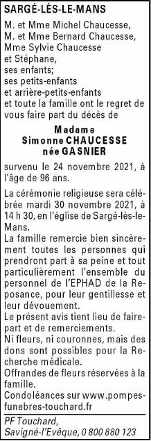 Décédée à Le Mans (72000, France) le mercredi 24 novembre 2021 à l'âge de 96 ans