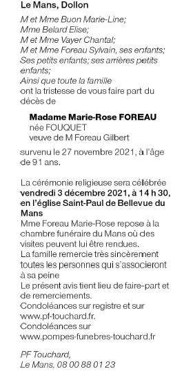Décédée à Le Mans (72000, France) le samedi 27 novembre 2021 à l'âge de 91 ans