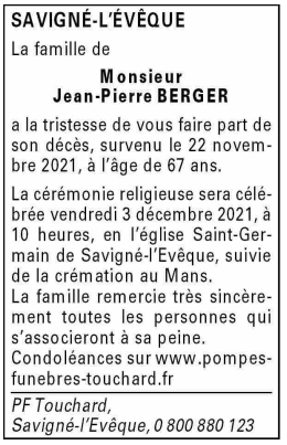 Décédé à Savigné-l'Évêque (72460, France) le lundi 22 novembre 2021 à l'âge de 67 ans