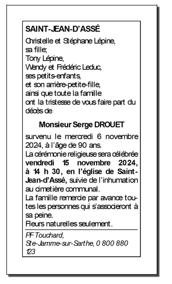 Décédé à Saint-Jean-d'Assé (72380, France) le mercredi 6 novembre 2024 à l'âge de 90 ans