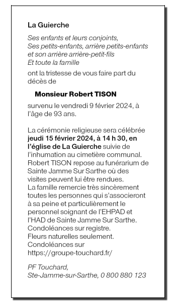 Décédé à Sainte-Jamme-sur-Sarthe (72380, France) le vendredi 9 février 2024 à l'âge de 93 ans