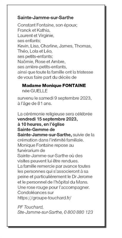Décédée à Le Mans (72000, France) le samedi 9 septembre 2023 à l'âge de 81 ans