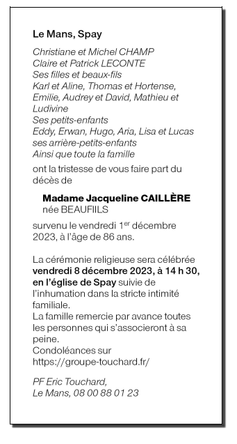 Madame Jacqueline Raymonde CAILLÈRE née BEAUFILS