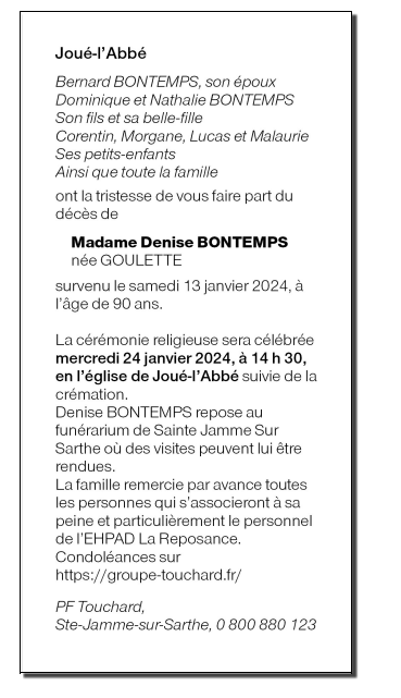 Epouse de Monsieur Bernard Gabriel BONTEMPS
