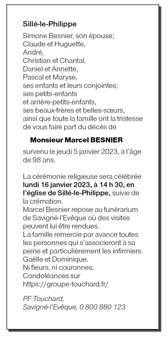 Décédé à Sillé-le-Philippe (72460, France) le jeudi 5 janvier 2023 à l'âge de 98 ans