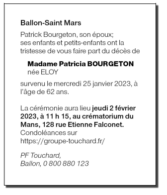 Décédée à Ballon-Saint Mars (72290, France) le mercredi 25 janvier 2023 à l'âge de 62 ans