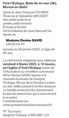 Décédée à Yvré-l'Évêque (72530, France) le dimanche 30 janvier 2022 à l'âge de 85 ans