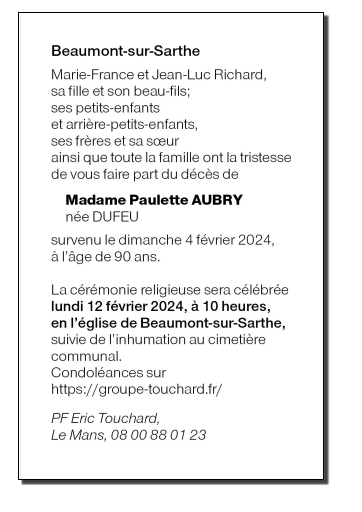 Veuve de Monsieur Bernard Louis Emile AUBRY