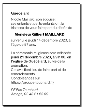 Décédé à Guécélard (72230, France) le jeudi 14 décembre 2023 à l'âge de 87 ans