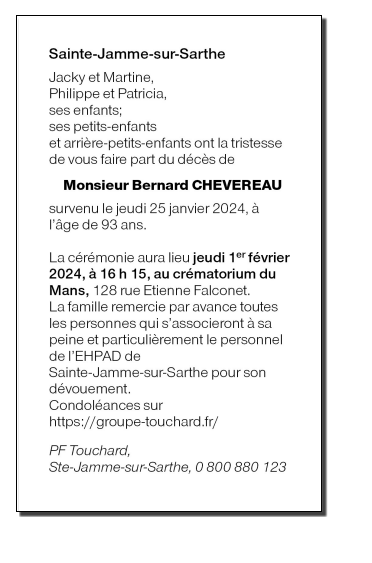 Décédé à Sainte-Jamme-sur-Sarthe (72380, France) le jeudi 25 janvier 2024 à l'âge de 93 ans