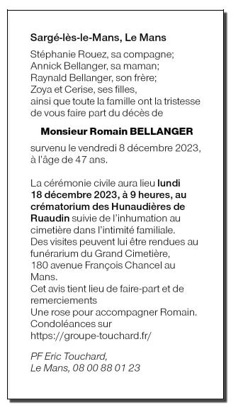 Décédé à Sargé-lès-le-Mans (72190, France) le vendredi 8 décembre 2023 à l'âge de 47 ans