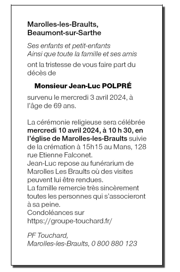 Décédé à Le Mans (72000, France) le mercredi 3 avril 2024 à l'âge de 69 ans