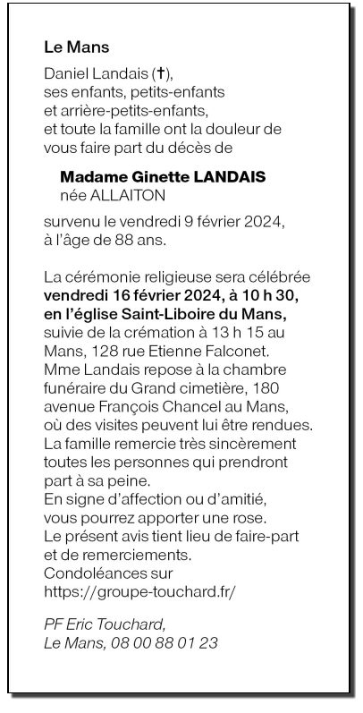 Décédée à Le Mans (72000, France) le vendredi 9 février 2024 à l'âge de 88 ans