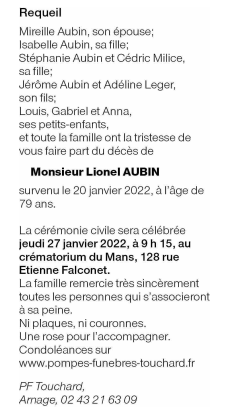 Décédé à Le Mans (72000, France) le jeudi 20 janvier 2022 à l'âge de 79 ans