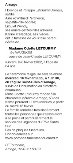 Veuve de Monsieur Jean-Claude, Georges, Ernest LETOURMY