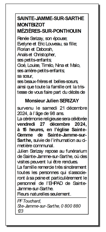 Décédé à Le Mans (72000, France) le samedi 21 décembre 2024 à l'âge de 98 ans