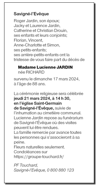 Décédée à Coulaines (72190, France) le dimanche 17 mars 2024 à l'âge de 88 ans