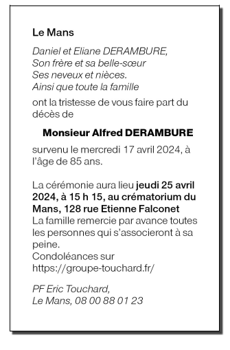 Décédé à Allonnes (72700, France) le mercredi 17 avril 2024 à l'âge de 85 ans