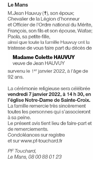 Décédée à Le Mans (72000, France) le samedi 1 janvier 2022 à l'âge de 92 ans