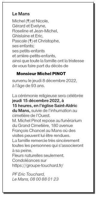 Décédé à Ruaudin (72230, France) le jeudi 8 décembre 2022 à l'âge de 93 ans