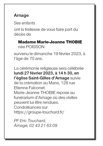 Décédée à Angers (49000, France) le dimanche 19 février 2023 à l'âge de 70 ans