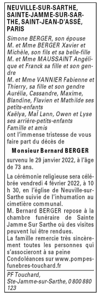 Décédé à Neuville-sur-Sarthe (72190, France) le samedi 29 janvier 2022 à l'âge de 73 ans