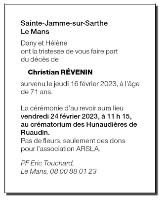 Décédé à Le Mans (72000, France) le jeudi 16 février 2023 à l'âge de 71 ans
