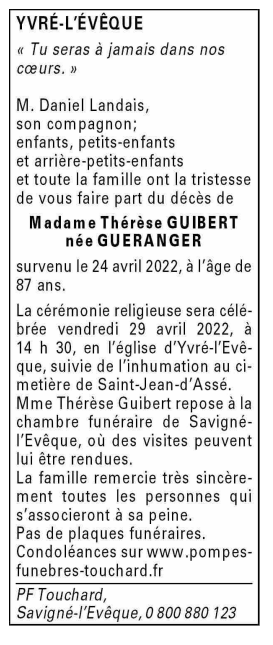 Décédée à Le Mans (72000, France) le dimanche 24 avril 2022 à l'âge de 87 ans