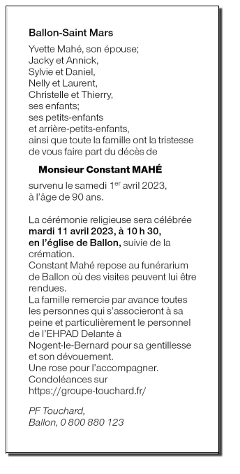 Décédé à La Ferté-Bernard (72400, France) le samedi 1 avril 2023 à l'âge de 90 ans