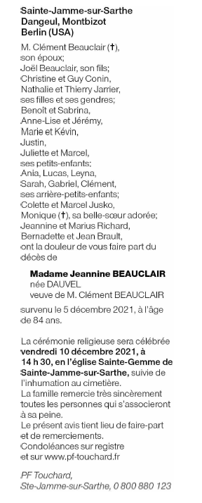 Décédée à Sainte-Jamme-sur-Sarthe (72380, France) le dimanche 5 décembre 2021 à l'âge de 84 ans