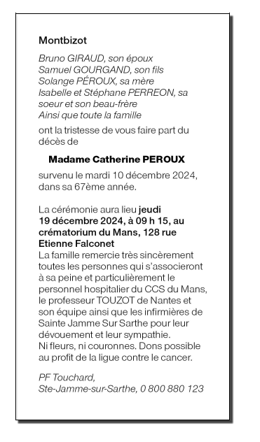 Décédée à Le Mans (72000, France) le mardi 10 décembre 2024 à l'âge de 66 ans