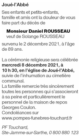 Décédé à Le Mans (72000, France) le jeudi 2 décembre 2021 à l'âge de 89 ans