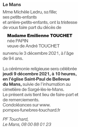 Décédée à Allonnes (72700, France) le vendredi 3 décembre 2021 à l'âge de 94 ans