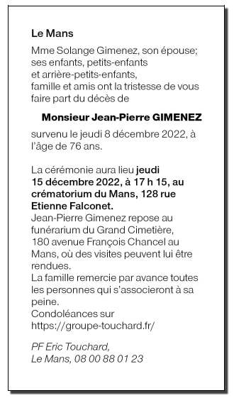 Décédé à Le Mans (72000, France) le jeudi 8 décembre 2022 à l'âge de 76 ans